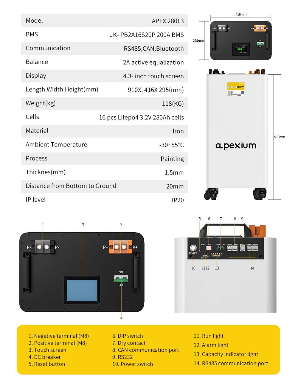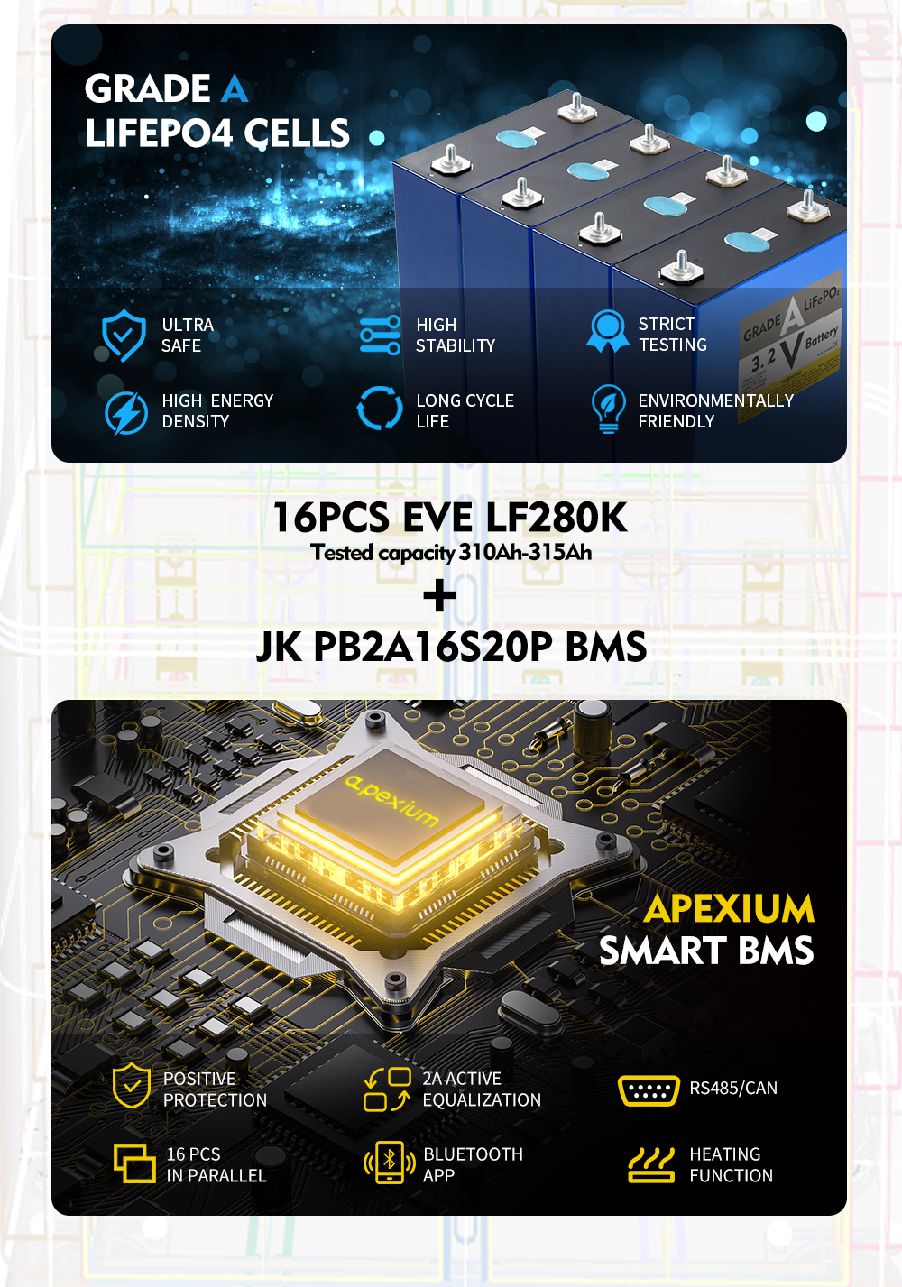 The integrated JK PB2A16S20P 200A BMS with 2A active equalization ensures optimal performance and safety for your LiFePO4 battery case. With support for RS485, CAN, and Bluetooth, you can monitor and manage your lithium battery box via the Android/iOS app, providing real-time insights into voltage, current, and battery health.