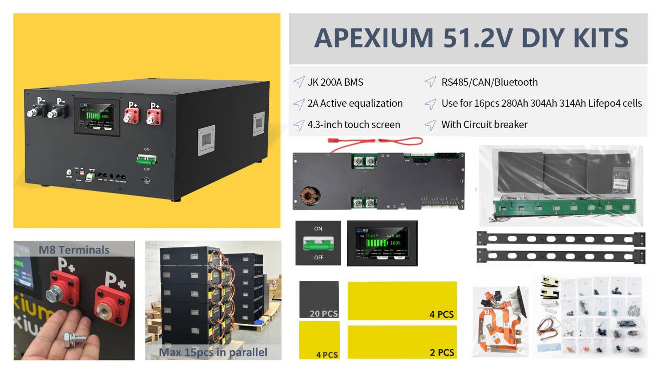 A DIY LiFePO4 battery box, such as the Apexium 280Ah kit, is designed for constructing custom energy storage systems for applications like solar power storage, RV camping, marine systems, or off-grid setups. It offers a secure and efficient way to house and manage LiFePO4 battery cells.